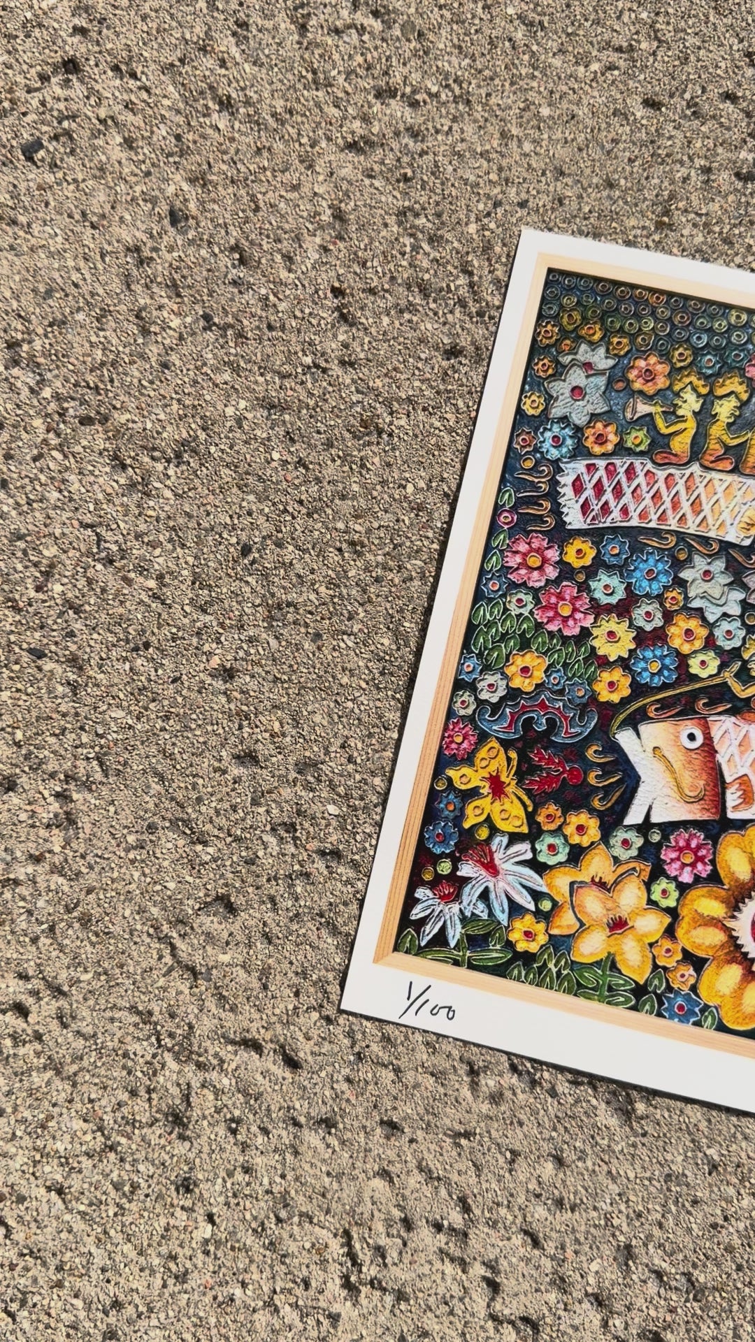 This small-format print is bursting with color and dynamic energy, showcasing a dense, joyful scene of flowers, butterflies, and two stylized Koinobori fish. Small, charming figures carrying instruments ride atop the fish, adding a festive, spiritual layer. This highly accessible print is a perfect way to add an element of cultural richness and texture to a gallery wall or small space.